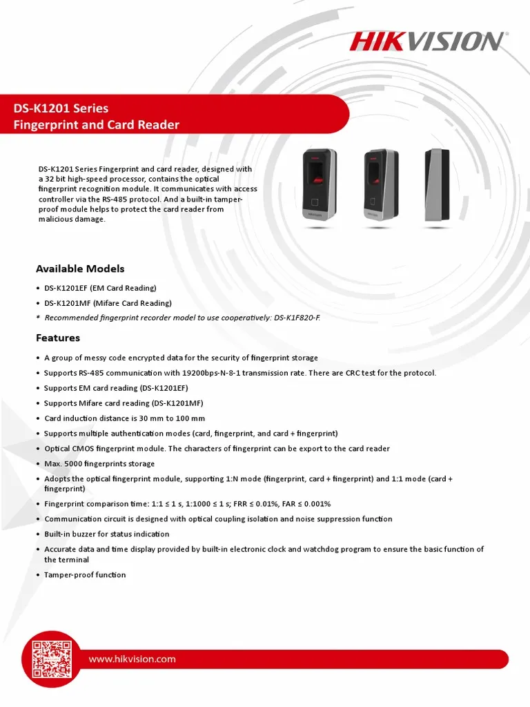 The Hikvision DS-K1201AMF is a fingerprint and card reader designed to enhance access control and security in residential, commercial, and institutional environments. It supports dual-factor authentication using both biometric fingerprint recognition and RFID card verification, providing faster and more secure access management compared to single-method systems. The device features a responsive fingerprint sensor that accurately captures and verifies fingerprints, reducing the risk of unauthorized entry. The integrated card reader offers convenient secondary authentication using RFID cards, giving users flexible access options. Built for seamless integration with Hikvision access control panels and systems, the DS-K1201AMF enables centralized management, real-time monitoring, and detailed event logging for improved security oversight. Its durable and compact design allows for easy installation near entry points, doorways, and restricted areas. With intuitive operation and reliable performance, this fingerprint and card reader delivers secure, efficient, and user-friendly access control, making it an effective solution for modern security systems.