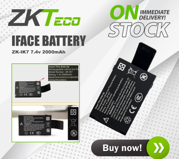 The ZKTeco ZK-IK7 7.4V 2000mAh iFace800 Battery is a reliable and high-quality power accessory specifically designed to support uninterrupted operation of the iFace800 biometric access control terminal. With a capacity of 2000mAh at 7.4 volts, this rechargeable battery provides dependable backup power to ensure continued device functionality during power outages, maintenance periods, or unstable power conditions—safeguarding security operations without interruption. Engineered to meet the rigorous performance requirements of security applications, the ZK-IK7 battery delivers stable voltage output and consistent energy delivery throughout its discharge cycle, helping maintain smooth operation of display panels, sensors, and communication modules. Its compact and robust design facilitates quick and secure installation within the iFace800 device housing, minimizing downtime and simplifying maintenance procedures for security professionals. Built with durable battery cells and protective circuitry, it offers long service life and reliable performance across repeated charge cycles. Ideal for environments where access control continuity is critical—such as offices, commercial buildings, industrial facilities, and residential complexes—the ZKTeco ZK-IK7 7.4V 2000mAh battery provides a professional, dependable backup power solution that enhances system resilience and operational reliability.